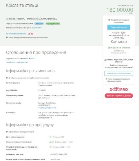 Аукціон стартує після 29 березня, а очікувана вартість послуг становить 180 000 грн. Тендер оголосили 17 березня, вже після введення воєнного стану в Україні та на 22 день війни.
