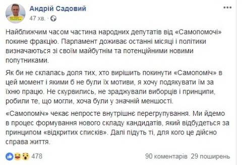 "Найближчим часом частина народних депутатів від "Самопомочі" покине фракцію. Парламент доживає останні місяці і політики визначаються зі своїм майбутнім та потенційними новими попутниками" – наголосив Андрій Садовий.
