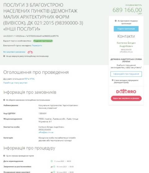 Комунальне підприємство "Адміністративно-технічне управління" оголосило тендер у системі ProZorro на послуги з демонтажу малих архітектурних форм (вивісок), які переможець тендеру має здійснити до 31 грудня 2023 року.