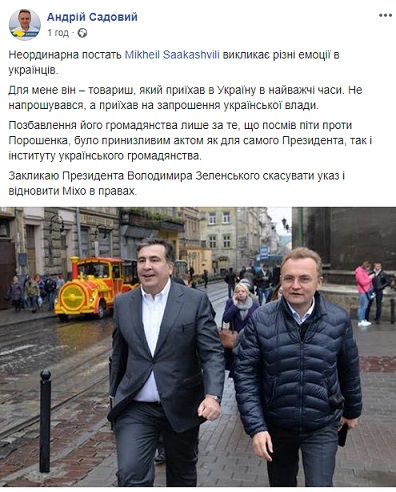 Лідер партії "Самопоміч" Андрій Садовий звернувся до президента Володимира Зеленського з закликом скасувати указ його попередника Петра Порошенка і відновити українське громадянство Міхеіла Саакашвілі.