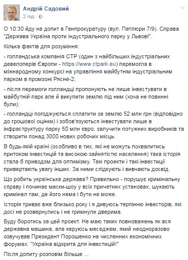 "Що робить українська держава? Правильно – порушує кримінальну справу і починає маски-шоу у всіх причетних установах, шукають кримінал там, де його нема і бути не може. Історія триває вже близько року, і я дивуюсь терпінню інвесторів, які досі не розвернулись і не гримнули дверима", – написав Андрій Садовий.