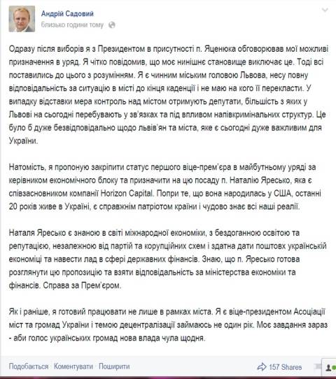 "Попри те, що вона народилась у США, останні 20 років живе в Україні, є справжнім патріотом країни і чудово знає всі наші реалії. Наталя Яресько є знаною в світі міжнародної економіки, з бездоганною освітою та репутацією, незалежною від партій та корупційних схем і здатна дати поштовх українській економіці та навести лад в сфері державних фінансів", написав Садовий.