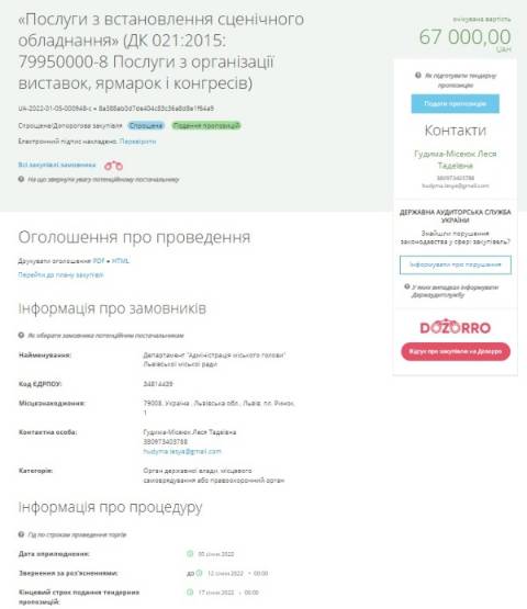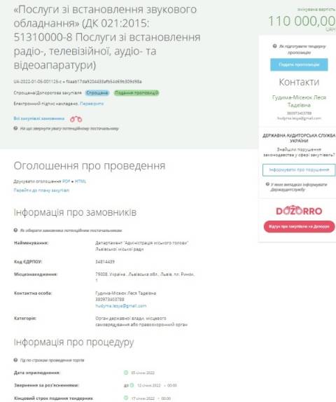 Департамент "Адміністрація міського голови" Львівської міської ради оголосив закупівлю у системі ProZorro на послуги з встановлення сценічного обладнання та послуги зі встановлення радіо-, телевізійної, аудіо- та відеоапаратури у Львові.