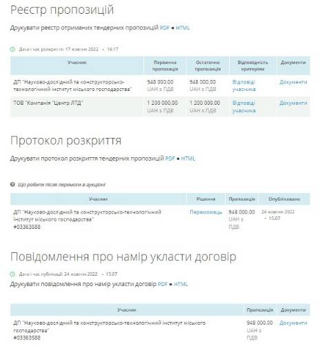 Аукціон стартував 17 жовтня, участь у ньому взяли ДП "Науково-дослідний та конструкторсько-технологічний інститут міського господарства" та ТОВ "Компанія "Центр ЛТД", які запропонували за свої послуги 948 000 грн і 1 200 000 грн відповідно. переможцем обрали ДП "Науково-дослідний та конструкторсько-технологічний інститут міського господарства", а очікувана вартість послуг становила 1 200 000 грн.