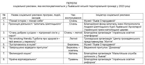 Згідно з документом, впродовж 2023 року на території Львівської громади розмістять 55 одиниць соціальної реклами на 1015 рекламних площинах:
