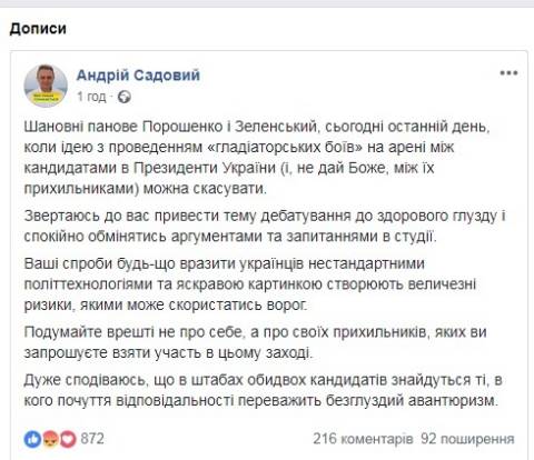 "Шановні панове Порошенко і Зеленський, сьогодні останній день, коли ідею з проведенням "гладіаторських боїв" на арені між кандидатами в Президенти України (і, не дай Боже, між їх прихильниками) можна скасувати. Звертаюсь до вас привести тему дебатування до здорового глузду і спокійно обмінятись аргументами та запитаннями в студії" – написав Андрій Садовий.
