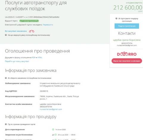 Управління земельних ресурсів департаменту містобудування Львівської міської ради оголосило тендер у системі ProZorro на послуги автотранспорту для службових поїздок, які переможець тендеру має поставляти до 31 грудня 2020 року.