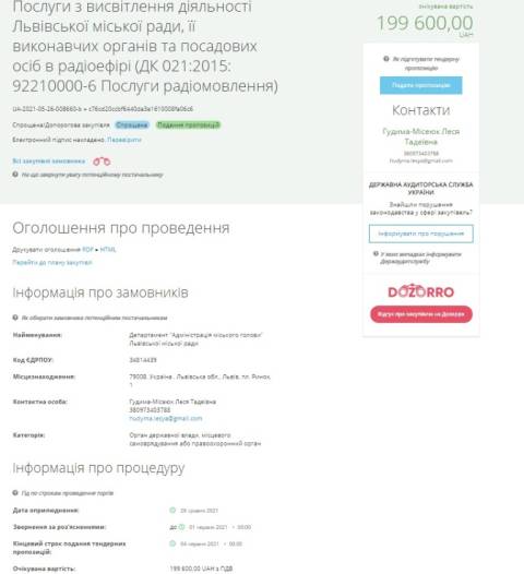 Департамент "Адміністрація міського голови" Львівської міської ради оголосила закупівлю у системі ProZorro на послуги з висвітлення діяльності Львівської міської ради, її виконавчих органів та посадових осіб в радіоефірі, які переможець тендеру має надати до 31 грудня 2021 року.