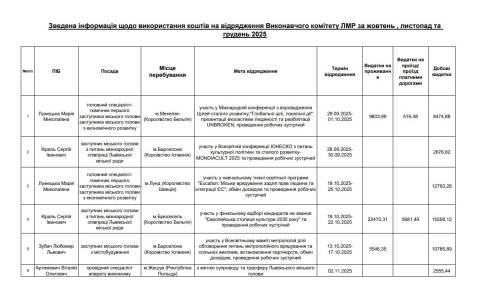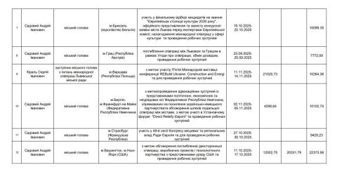 17-23 листопада – участь у заходах, які відбудуться в рамках програми Венеційської архітектурної бієнале 2025, участь у Міжнародному саміті CNN Portugal (м. Венеція, Італія, м. Алкобаса, Португалія). Витрати на відрядження – 17 890,09 грн (видатки на проживання – 0 грн, видатки на проїзд – 0 грн, добові – 17 890,09 грн);