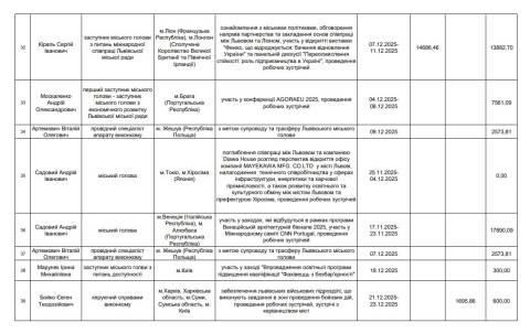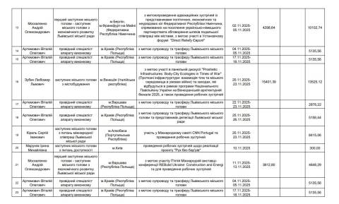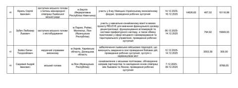 – 7-11 грудня – обговорення напрямів партнерства та закладення основ співпраці між Львовом та Ліоном, участь у відкритті виставки "Фенікс, що відроджується: бачення відновлення України" та панельній дискусії "Переосмислення стійкості: роль підприємництва в Україні" (м. Ліон, Франція, м. Лондон, Британія). Витрати на відрядження – 28 569,16 грн (видатки на проживання – 14 686,46 грн, видатки на проїзд – 0 грн, добові – 13 882,70 грн);