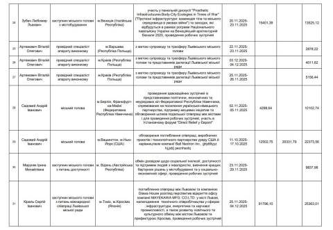 У жовтні-грудні минулого року в службових відрядженнях побували міський голова Львова Андрій Садовий, його заступники Андрій Москаленко, Сергій Кіраль, Любомир Зубач, Ірина Маруняк, а також керуючий справами виконкому Євген Бойко.