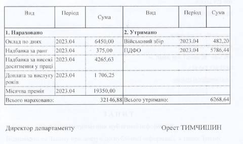 У квітні цього року директору департаменту житлового господарства та інфраструктури Львівської міської ради Оресту Тимчишину нарахували 32 146,88 грн заробітної плати. Зокрема, у цю суму увійшли такі виплати: