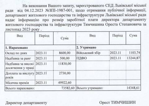 У листопаді цього року директору департаменту житлового господарства та інфраструктури Львівської міської ради Оресту Тимчишину нарахували 73 582,60 грн заробітної плати. Зокрема, у цю суму увійшли такі виплати: