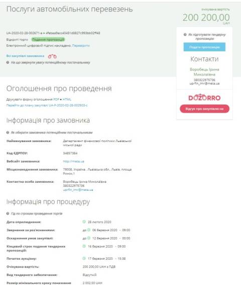 Департамент фінансової політики Львівської міської ради вдруге оголосив тендер у системі ProZorro на послуги з автомобільних перевезень, які переможець тендеру має поставляти до 31 грудня 2020 року.