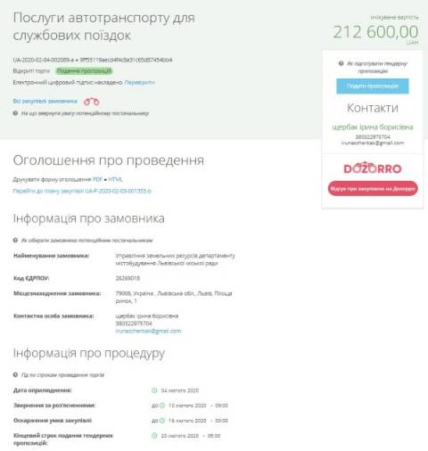 Управління земельних ресурсів департаменту містобудування Львівської міської ради оголосило повторний тендер у системі ProZorro на послуги автотранспорту для службових поїздок, які переможець тендеру має поставляти до 31 грудня 2020 року.