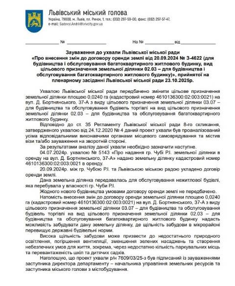 Щодо ухвали про внесення змін до договору оренди землі, то земельна ділянка передавалась для обслуговування нежитлової будівлі й жодного нового будівництва, згідно з умовами договору оренди землі, тут не передбачено. У міськраді наголосили, що висока щільність забудови може призвести до недостатнього природного освітлення, погіршення вентиляції, зменшення зелених насаджень та створення небезпечних умов для життя, зокрема, через недостатню кількість паркувальних місць та перевантаженість шкіл та дитячих садків.
