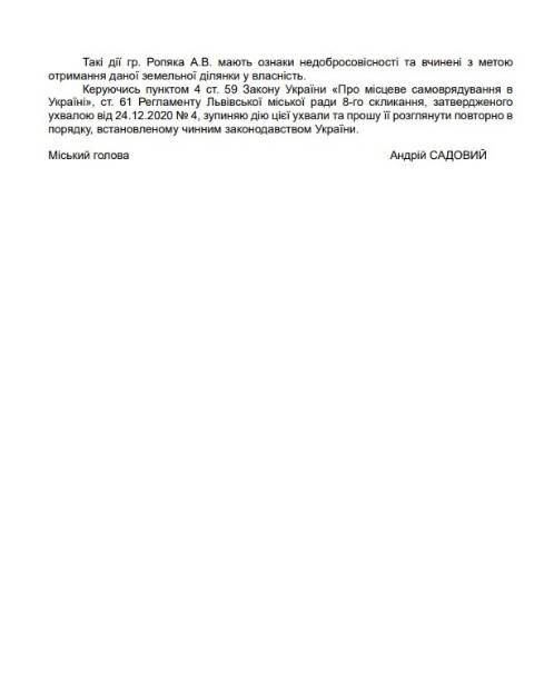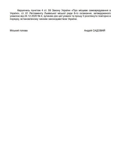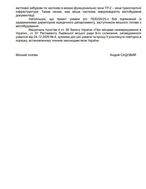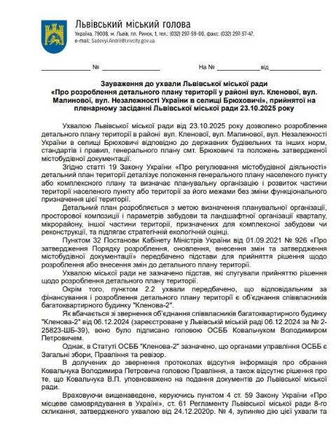 Згідно з документом, причинами ветування цих ухвали є те, що вони не враховують низку вимог. Зокрема, ухвала щодо Брюховичів не має підстав, які слугували прийняттю рішення щодо розроблення детального плану території.