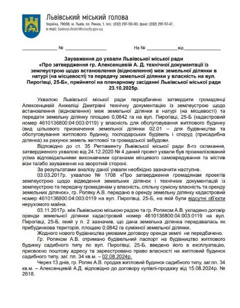 Натомість в ухвалі про передачу земельної ділянки у власність на вул. Пирогівці, 25-Б Анжеліці Алексенцевій, то тут, за умовами договору оренди землі, не передбачено жодного нового будівництва, а дії мають ознаки недобросовісності й вчинені з метою отримання даної земельної ділянки у власність.