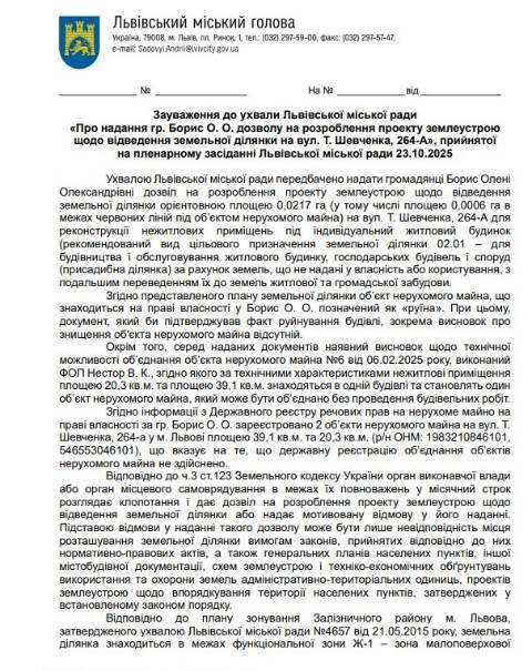 Щодо дозволу Олені Борис на розроблення проєкту землеустрою щодо відведення земельної ділянки на вул. Т. Шевченка, 264-А, то ділянка знаходиться в межах функціональної зони Ж-1 – зона малоповерхової житлової забудови та частково в межах функціональної зони ТР-2 – зона транспортної інфраструктури. Тому існує часткова невідповідність містобудівній документації.