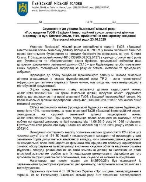 Щодо ухвали про передачу в оренду ТзОВ "Західний інвестиційний союз" земельної ділянки на вул. Княгині Ольги, 110, то ділянка знаходиться в межах функціональної зони ТР-2 – зона транспортної інфраструктури (вулична мережа) й не відповідає містобудівній документації.