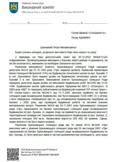 Зазначимо, у грудні 2022 року приміщення школи у Брюховичах на вул. Буковій, яку почали будувати ще у 90-х роках, на електронних торгах придбала приватна фірма. З 2007 року школа перебувала на балансі Брюховицької селищної ради, проте без зареєстрованого права власності.