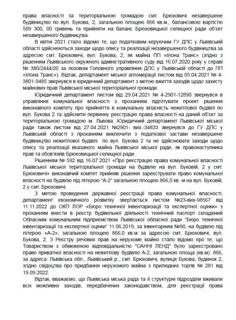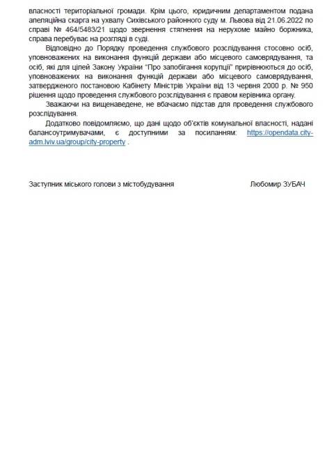 "Вважаємо, що Львівська міська рада та її структурні підрозділи вживали всіх можливих заходів, передбачених законодавством, для реєстрації права власності територіальної громади. Крім цього, юридичним департаментом подана апеляційна скарга на ухвалу Сихівського районного суду м. Львова від 21.06.2022 по справі № 464/5483/21 щодо звернення стягнення на нерухоме майно боржника, справа перебуває на розгляді в суді.