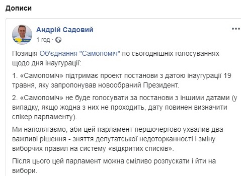 За його словами, "Самопоміч" підтримає проект постанови з датою інаугурації 19 травня, яку запропонував новообраний президент і партія не буде голосувати за постанови з іншими датами.