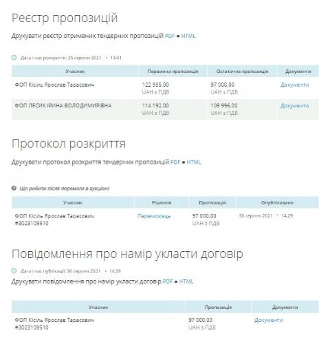 Аукціон стартував 25 серпня, участь у ньому взяли двоє фізичних осіб-підприємців – Ярослав Кісіль та Ірина Лесик, які запропонували доставити міськраді одяг за 97 000 грн і 109 996 грн відповідно. Переможцем обрали Ярослава Кісіля, а початкова вартість закуплі становила 130 000 грн.