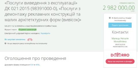 У закупівлі йдеться про демонтаж 20 видів різних рекламних конструкцій та вивісок.