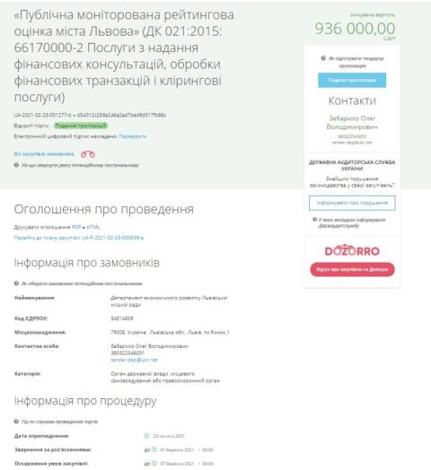 Департамент економічного розвитку Львівської міської ради оголосив тендер у системі ProZorro на публічну моніторовану рейтингову оцінку Львова – послуги з надання фінансових консультацій, обробки фінансових транзакцій і клірингові послуги, яку переможець тендеру має здійснити до 31 грудня 2021 року.