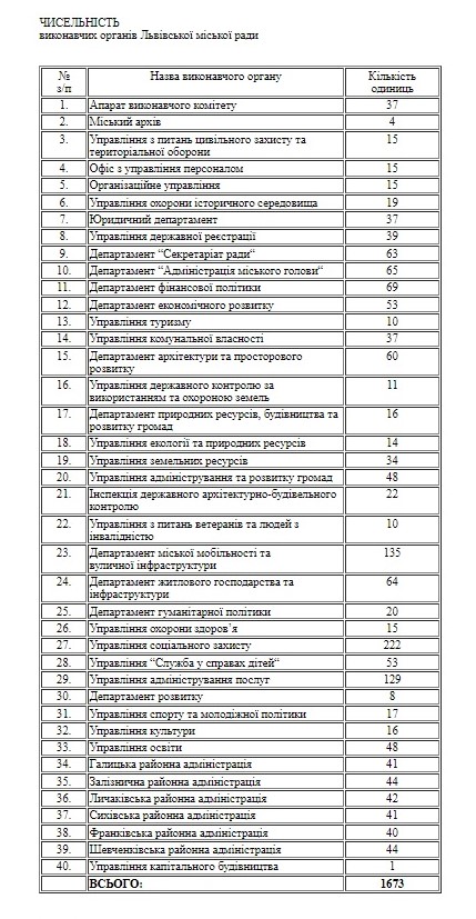 Загальну чисельність апарату Львівської міськради та її виконавчих органів збільшили до 1673 осіб.