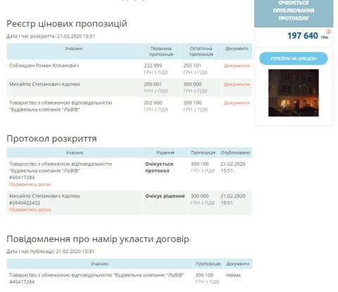 Аукціон стартував 21 лютого, участь у ньому взяли Роман Собчишин, Михайло Карпюк та ТзОВ "Будівельна компанія "Львів", які запропонували придбати приміщення за 250 101 грн, 300 000 грн і 300 100 грн відповідно. Переможцем обрали ТзОВ "Будівельна компанія "Львів", а початкова вартість приміщення становила 197 640 грн.