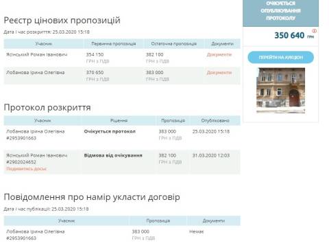 Аукціон стартував 25 березня, участь у ньому взяли Роман Ясінський та Ірина Лобанова, які запропонували придбати приміщення за 382 100 грн і 383 000 грн відповідно. Переможцем обрали Ірину Лобанову, а початкова вартість приміщення становила 350 640 грн.