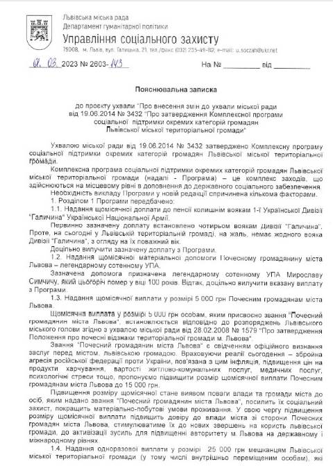 Про це йдеться у проєкті ухвали, опублікованій на інформаційному порталі депутатів Львівської міської ради 13 березня 2023 року.