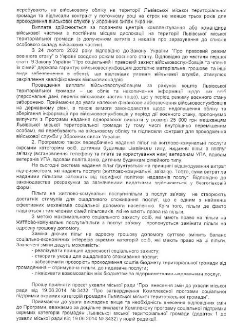 - вилучити з програми надання одноразової виплати у розмірі 25 000 грн мешканцям Львівської МТГ, які перебувають на військовому обліку та підписали контракт для проходження військової служби у ЗСУ (це хочуть зробити через фінансове забезпечення військовослужбовців на державному рівні, а також на вимогу законодавства щодо недопущення обліку та зберігання інформації про військовослужбовців у період дії воєнного стану);