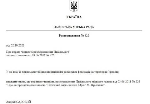 "У зв'язку із повномасштабним вторгненням російської федерації на територію України вважати таким, що втратило чинність розпорядження Львівського міського голови від 03.06.2011 № 226 "Про нагородження відзнакою "Почесний знак святого Юрія" М. Фрідмана" – йдеться у розпорядженні.