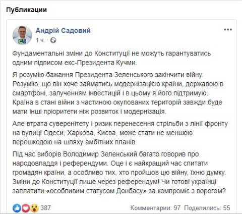 Андрій Садовий вважає, що внести зміни до Конституції можна лише після отримання результатів референдуму щодо доцільності формули "Штайнмаєра". І закликає Президента України Володимира Зеленського провести такий референдум.