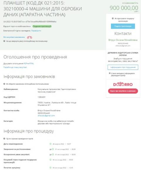 Комунальне підприємство "Адміністративно-технічне управління" оголосило тендер у системі ProZorro на придбання планшетів, які переможець тендеру має поставити до 21 листопада 2022 року.