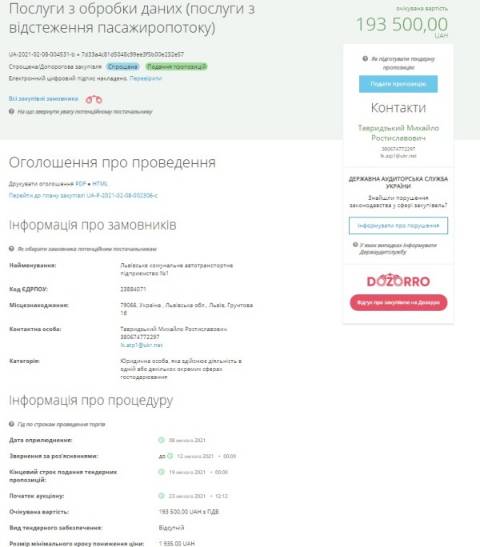 Львівське комунальне автотранспортне підприємство №1 оголосило тендер у системі ProZorro на послуги з обробки даних (послуги з відстеження пасажиропотоку), які переможець тендеру має поставляти з 1 березня до 31 грудня 2021 року.