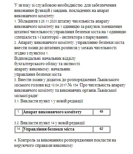 Зокрема, чисельність апарату виконавчого комітету збільшили на 1 одиницю, натомість на таку ж кількість скоротили чисельність управління безпеки міста за рахунок посади спеціаліста 1-ї категорії – інспектора з паркування відділу інспекторів з паркування.