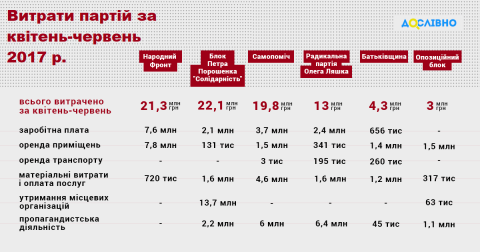 Натомість Радикальна партія Олега Ляшка витратила 13 млн грн. 45% всіх коштів пішло на рекламу по ТБ, а на заробітну плату партія витратила 2,4 млн грн, на оренду приміщень – 0,3 млн грн.