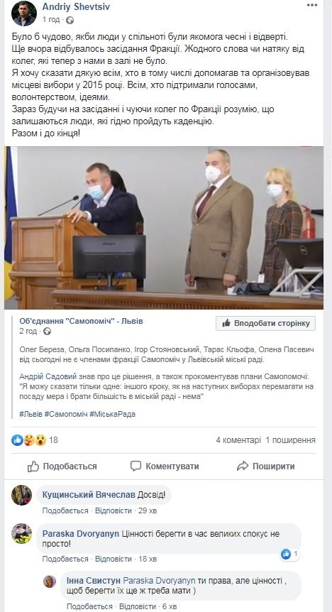 Перші сопельки нещастя почав виливати самопомічний депутат Андрій Шевців, колишній парасоленосець Садового, який ніяк не навчиться писати свої пости українською мовою. Але найцікавіше у нього вже звично у коментах, де буйним цвітом проростає побожна галицька фільозофія депутатки Параски Дворянин ("Цінності берегти у час великих спокус непросто") та непорочної начальниці управління комунальної власності Львівської міськради (а також самопомічної депутатки Львівської облради) Інни Свистун, яка незабаром у своїй фінансовій святості зморщиться до жменьки мироточивих мощей ("Цінності, щоб берегти їх, ще треба мати").