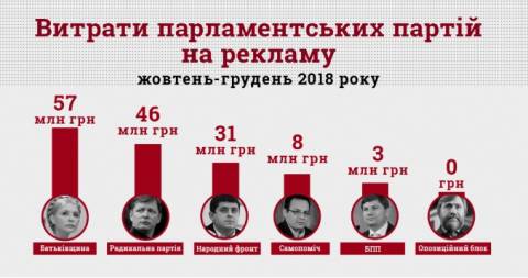 Упродовж жовтня-грудня 2018 року парламентські політичні партії витратили на оплату рекламних матеріалів 147 млн. грн. Окремі політичні сили оплатили рекламу за гроші, отримані з Державного бюджету України. Загалом із 147 млн. витрат на рекламу понад 43 млн. були бюджетними грошима.