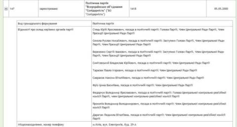 Ось витяг з сайту Мінюсту про регістрацію ВО "Справедливість", в якому Руслан Секела значиться як заступник голови ВО "Солідарність", член центральної ради та президії.