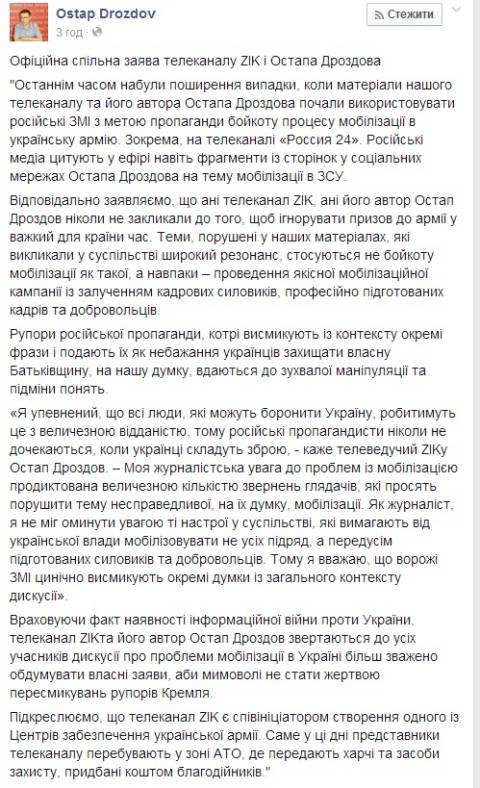 Водночас журналіст Остап Дроздов та телеканал ZIK оприлюднили офіційну заяву, в якій закликали не висмикувати з контексту окремі фрази. "Теми, порушені у наших матеріалах, які викликали у суспільстві широкий резонанс, стосуються не бойкоту мобілізації як такої, а навпаки – проведення якісної мобілізаційної кампанії із залученням кадрових силовиків, професійно підготованих кадрів та добровольців", йдеться у заяві.