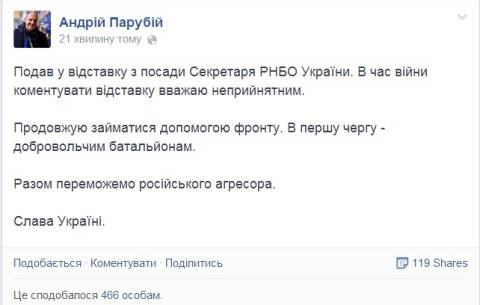 Президент Петро Порошенко прийняв відставку Парубія, написав у своєму Twitter прес-секретар глави держави Святослав Цеголко.
