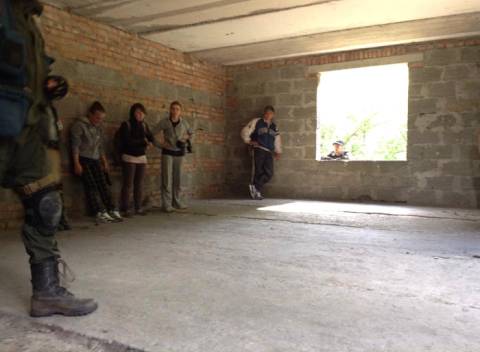 Активні тренування почалися з вибухів петард та спалахів димових шашок, що супроводжувалися криками інструктора "мордой в пол!", і закінчилися евакуацією поранених з "палаючого" будинку.