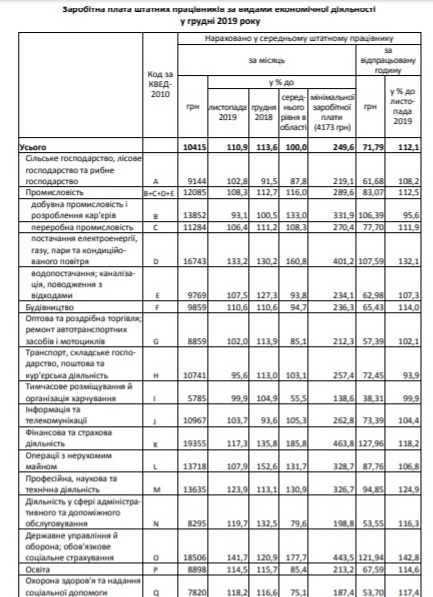 У грудні 2019 року середня заробітна плата становила 10 415 грн.