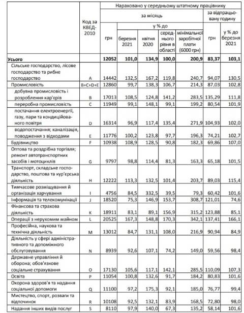 Порівняно з березнем цього року, середня зарплата одного працівника збільшився на 1%, а з квітнем 2020 року – зросла на 34,9%.