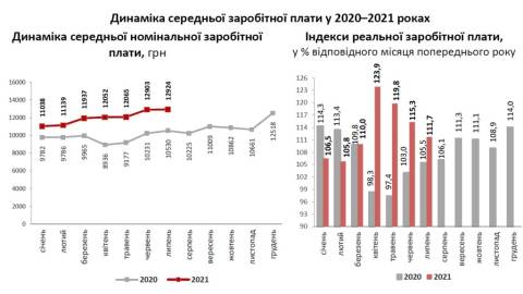 Індекс реальної заробітної плати у липні, порівняно із попереднім місяцем, становив 100,2%, а порівняно з липнем 2020 року – 111,7%.